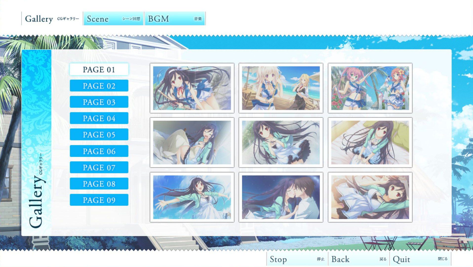 갤러리 모드입니다. 봤던 CG를 다시 볼 수 있는 기능입니다. 미소녀 게임이라면 거의 붙어있죠. 첫 페이지는 우미 관련 이미지로 도배되어 있군요. 제 안목이 좋다라고는 말하지 못합니다만 작화는 평타 수준으로 보고 있습니다.