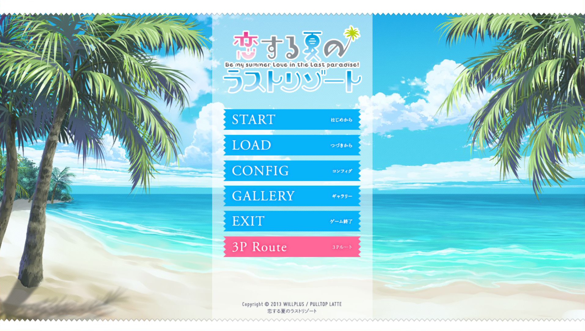 게임을 시작하면 타이틀 화면입니다. 스타트, 로드, 설정, 갤러리 등이 있습니다. 올클리어를 하고 나서 스샷을 찍었더니 무려 3P 루트가 열려있는 것을 확인할 수 있습니다.