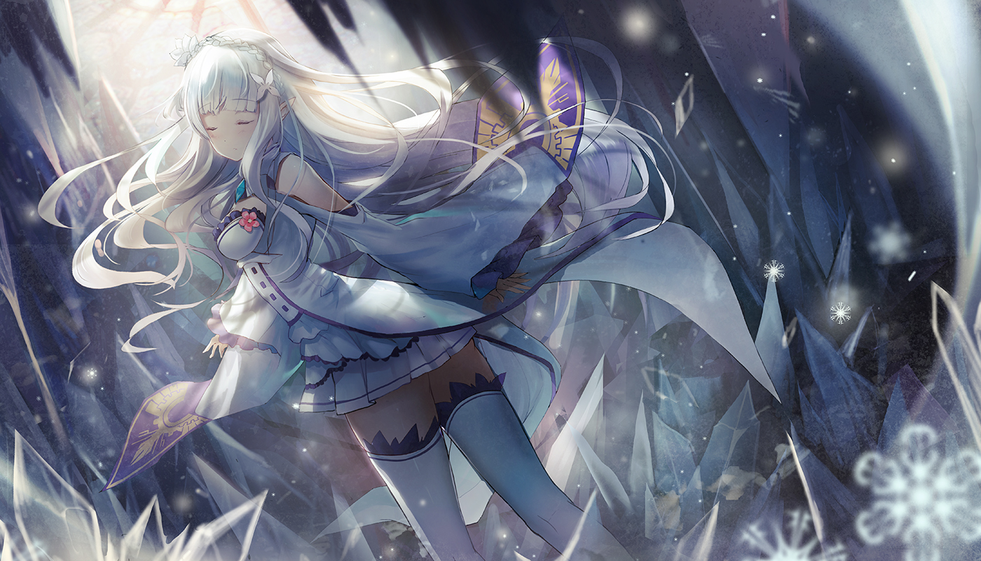 리제로를 논하면서 하나 더 덧붙여야 할 사항은 히로인 에밀리아의 디자인입니다. 제가 디자이너가 아니라서 디자인이 어떻다고 표현해도 될지는 모르겠지만 더 적절한 단어는 떠오르지 않는군요. 그 디자인이 굉장히 좋게 나왔습니다. 눈이 흩날리는 듯한 은발에 보라색과 금색이 섞인 흰색의 복장, 장미 같이 생긴 화려한 장식은 여태껏 나왔던 히로인들과는 다른 색다른 매력을 자랑합니다. 여러 일러스트레이터에게도 영감을 많이 주고 코스프레도 많이 나왔다고 해요. 역시나 시대를 풍미하는 아름다움을 표현했다고 봅니다.