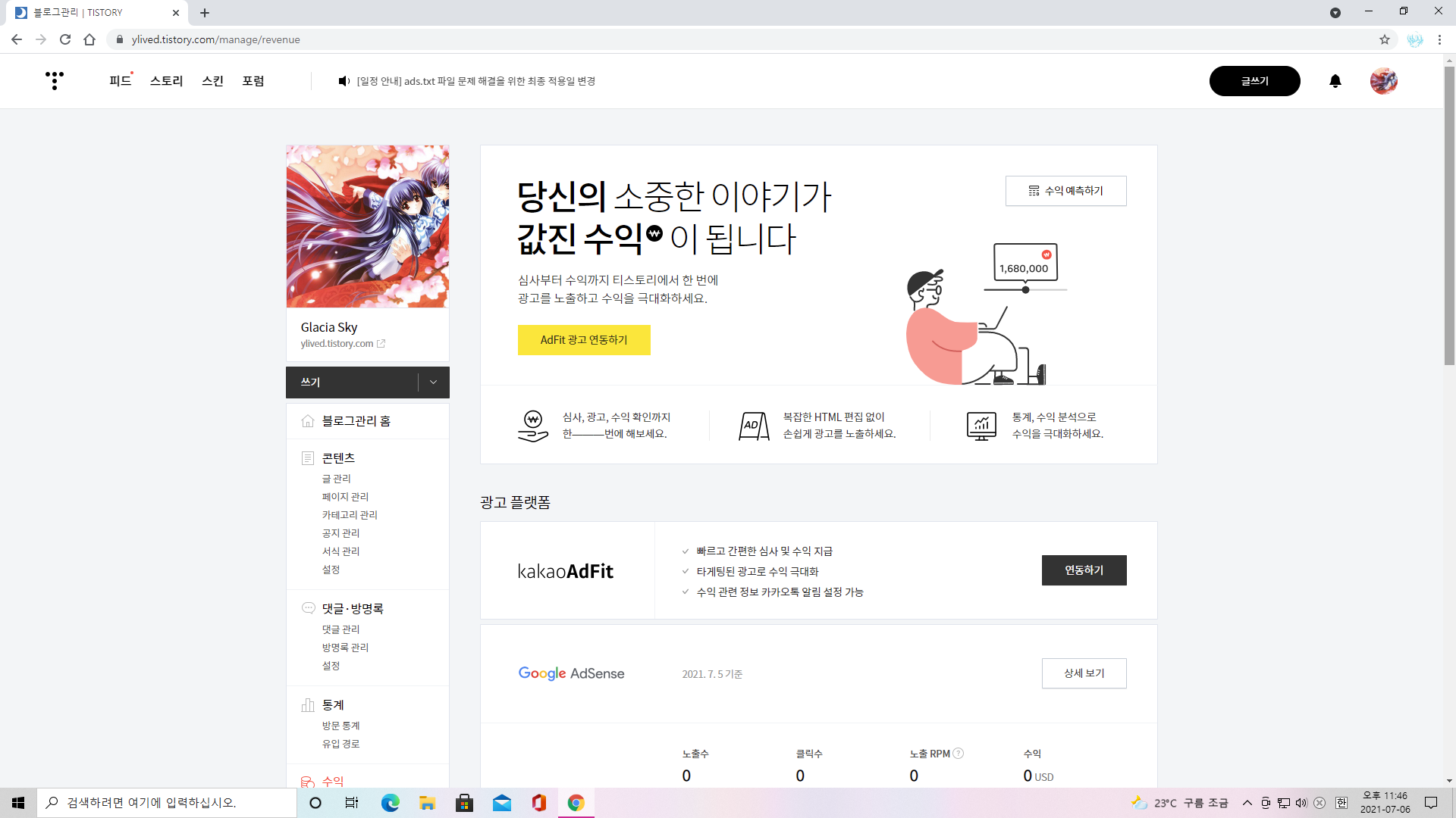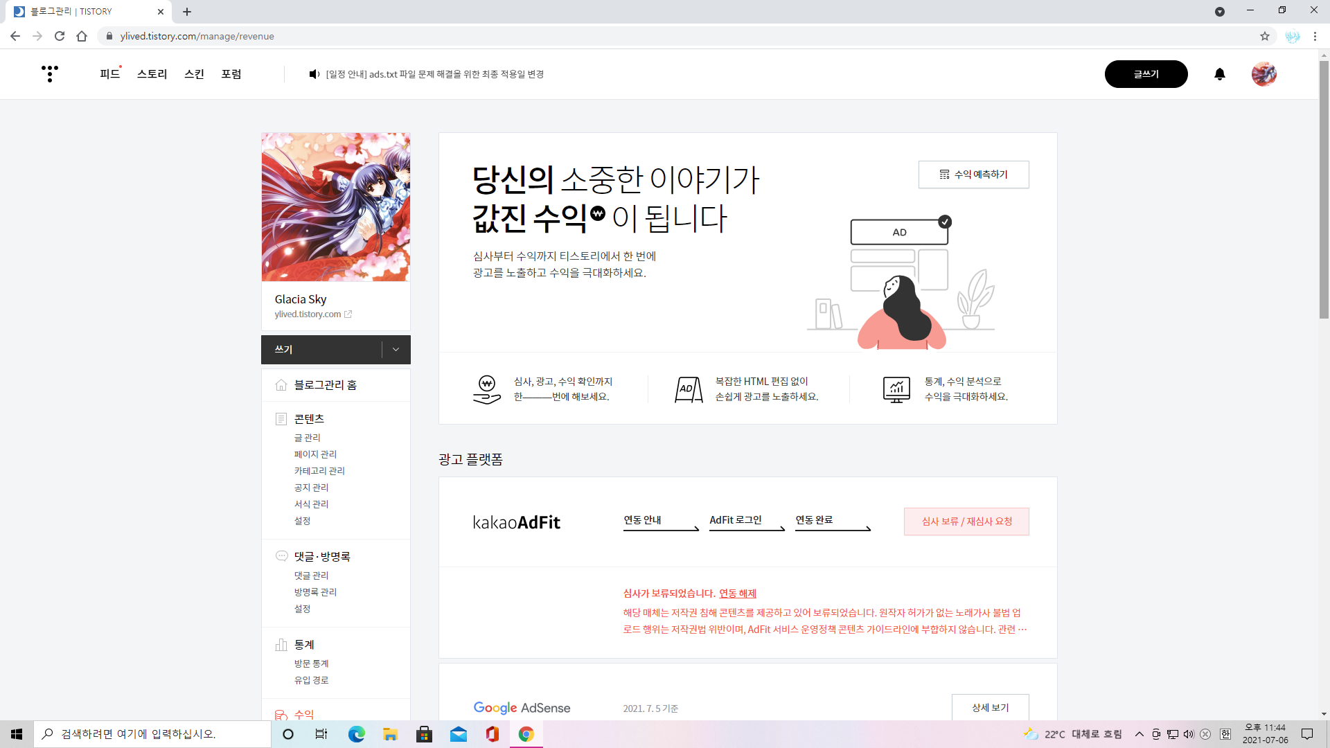 저는 잘 안됐지만 티스토리에서 카카오 애드핏도 지원한다고 하니까 되시는 분은 잘 활용하시면 되겠습니다. 적어도 블로그를 해서 수익이라는 성과를 얻을 수 있는 기회가 생긴 것이니까요.