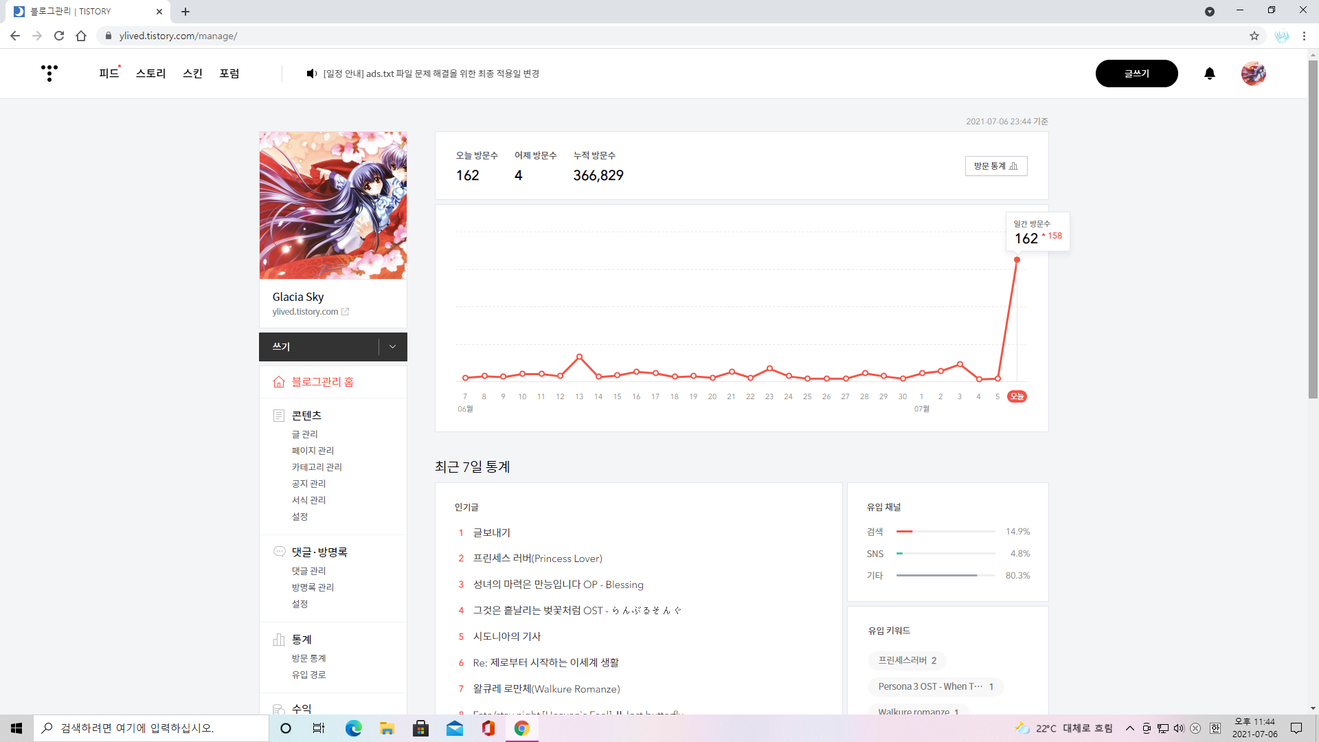 지금이 상상만하던 그 시기란 말이죠. 물론 그때 떠올리던 것과 비슷한 점도 있고 전혀 아닌 점도 있지만 현시점에서는 무슨 일이 벌어져도 이상하지 않을 시대인 것은 분명하다고 보입니다. 모든 가능성이 열려 있다고 해도 과언이 아니죠. 글쎄요, 저는 세기말과 밀레니엄 시대를 둘 다 겪어본 세대이다 보니 사고관이 약간 아직 세기말 쪽에 머물러 있기도 한데 그렇다고 밀레니엄 시대를 딱히 거부하는 편도 아니라서 심경이 복잡합니다. 사실 제가 여기까지 활동을 지속하고 있다는 것도 좀 실감이 안 날 때도 있어요. 일단 얘기해둡니다만 저는 진심으로 블로그의 유행이 이렇게 빨리 지나갈 것이라고는 생각하지 못했습니다. 인터넷에서 블로그의 체제가 한 100년은 갈 줄 알았어요. 하나의 매체가 생성이 돼서 쇠퇴를 하기까지 최소 한 세기는 걸릴 것이다라고 예상을 한 것이었는데 결과를 놓고 보니 시대상을 잘 고려하지 못하고 있었네요. 사람들의 인식의 변화가 제 생각보다 빨랐어요. 그래서 저는 그대로인 편인데 세상이 너무 변하니까 어색하기도 합니다. 이 얘기는 주제와는 다르니까 또 차차 나중에 이어서 해보기로 하고 다시 본론이었던 방문자 수 이야기로 돌아가 보겠습니다.