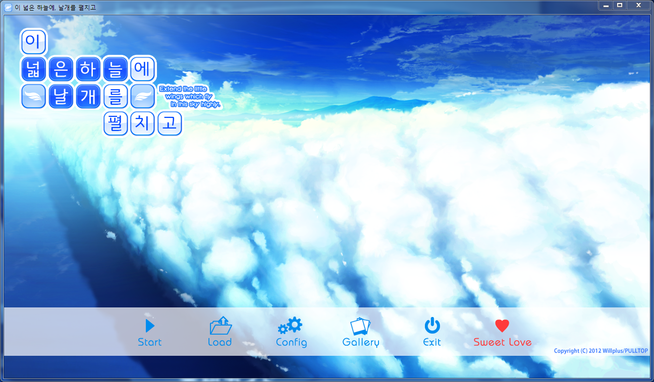 타이틀 화면에서 스타트를 누르면 게임이 처음부터 시작되고 로드를 누르면 세이브 했던 지점부터 다시 시작할 수 있고 컨피그를 누르면 설정. 갤러리를 누르면 회상 모드라고 해서 봤던 CG나 장면 등을 볼 수 있습니다. 엑시트를 누르면 게임이 종료되고요. 끝에 스위트 러브는 패치를 하면 실행할 수 있는 모드인데 추가 씬을 볼 수 있어요. 미연시 유저들은 익숙한 메뉴 화면이겠습니다.