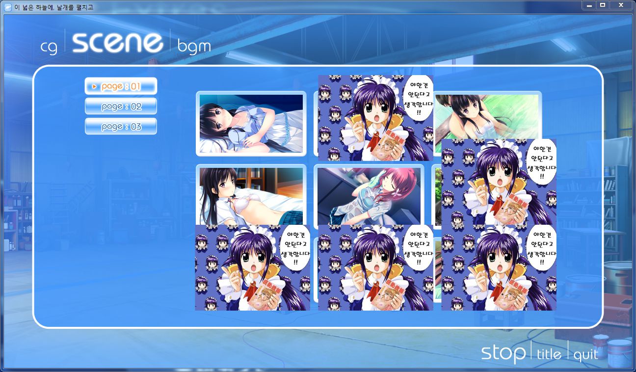 갤러리 모드에서 CG로 들어오게 되면 여지껏 모아 온 CG 일러스트를 다시 볼 수 있습니다. 사진은 역시 코토리 이미지로 가득 차 있군요. 몇몇 장면은 수위가 높다고 판단하여 애니 마호로매틱의 유명한 짤 '야한 건 안된다고 생각합니다!'로 막아두었습니다. 다른 히로인의 CG도 물론 다 있습니다. 당시 유행했던 SD 버전 일러도 충분. 총 12페이지까지 있군요.