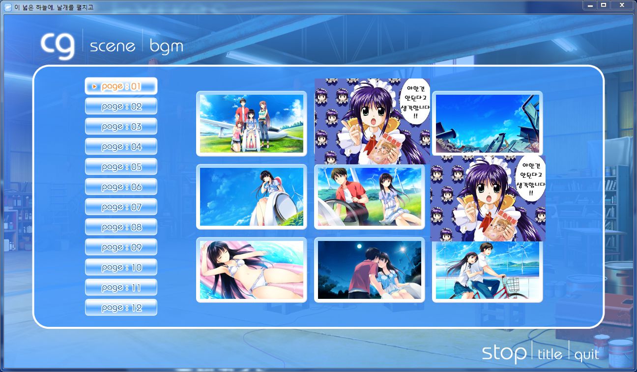 여기까지 이 넓은 하늘에, 날개를 펼치고. 코노소라 마무리를 해야 될 것 같습니다. 역시 저의 진행 속도는 (슬로우 페이스로) 타의 추종을 불허하는군요. 그나마 최근에는 조금 페이스가 빨라진 편입니다 ㅎㅎㅎ 지금보다 폼이 떨어졌을 때는 1년에 타이틀 한 개에 포스팅 하나 이런 식으로 가던 때도 있었으니까요; 미리 양해를 구해둘게요. 제가 듣기로는 미소녀 게임 유저 중에는 미연시를 세, 네 개를 한꺼번에 띄우고 플레이한다는 얘기도 들은 것 같은데 저는 그냥 한 번 할 때 한 타이틀 이런 식이라 그렇게는 무리일 듯합니다. 미래는 알 수 없겠지만요. 어쨌든 재밌게 하고 잘 끝났으면 일단 된 거죠~