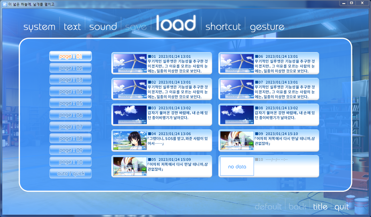 로드 화면입니다. 로드를 하면 세이브 했던 데이터를 불러올 수 있습니다. 세이브는 게임을 진행하다가 중간 중간 해주는 식입니다. 저는 혹시 모른다는 이유로 자주 하는 편입니다. 여러 군데 세이브를 해놓고 혹시 실수로 잘못 선택지를 고르거나 내용을 무심코 그냥 넘어가거나 하는 경우 로드, 불러오기를 해서 다시 시작을 하는 거죠. 스샷에서도 세이브를 많이 해놓았네요. 페이지는 넉넉해서 10페이지까지 있습니다.