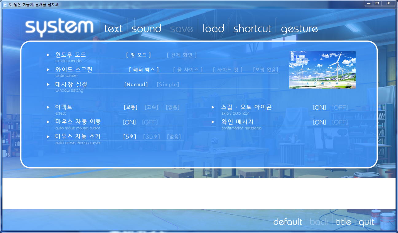 시스템 메뉴에서는 화면 크기 조정과 대사창 설정 이펙트 마우스 설정 등을 조정할 수 있습니다. 미소녀 게임들은 대부분 채용하고 있는 설정이지만 풀탑 게임은 그중에서도 편의가 더 좋은 편에 속합니다. 세세하게 신경을 써 주고 있군요. 저 같은 경우는 대체로 디폴트, 기본 설정으로 놓고 거의 건드리지 않는 편입니다.