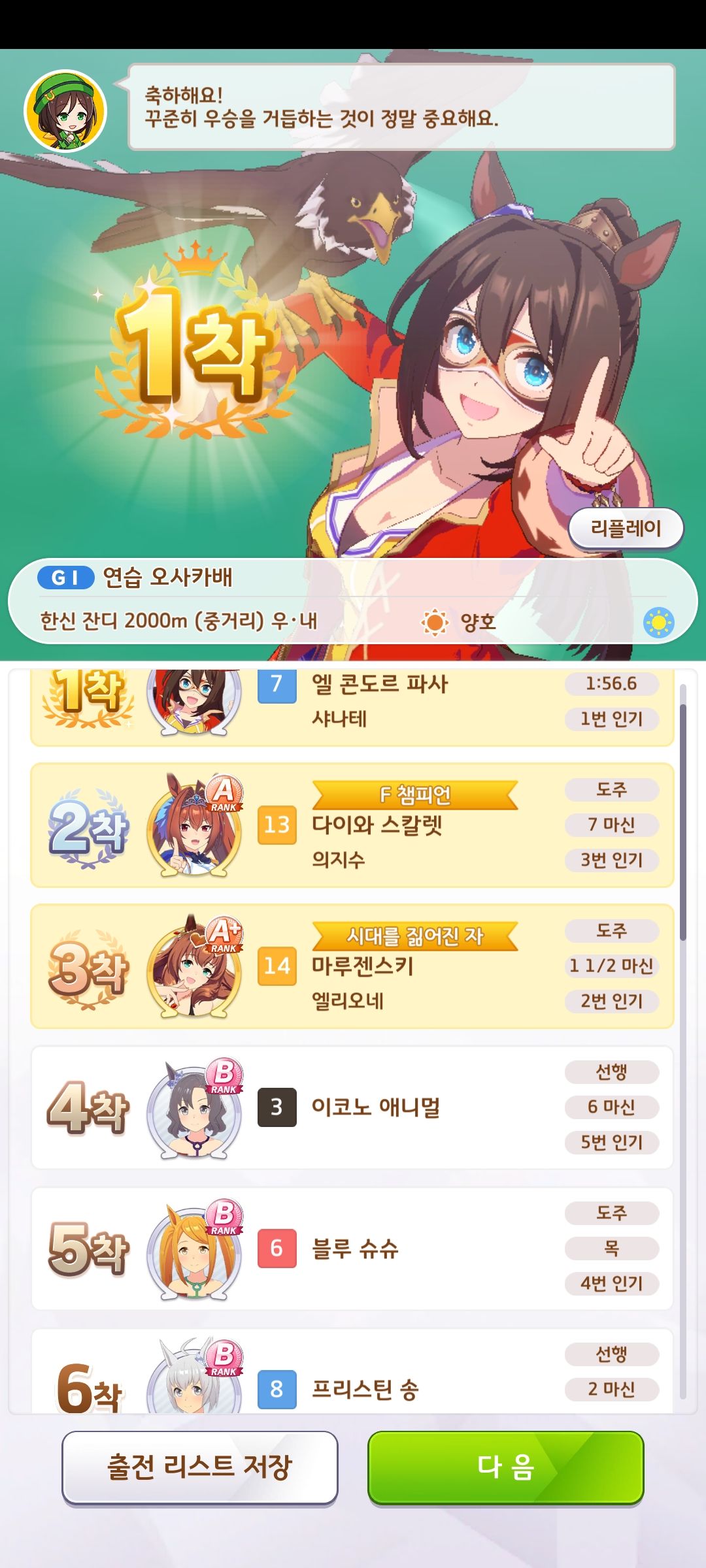 처음에는 잠시 리드하다가 금세 역전 당함 ㅎㅎ 랭크 차이도 있고 상대가 안 좋긴 했습니다 엘 콘도르 파사는 강력한 우마무스메죠. 인터넷 카더라 통신에 의하면 원본마도 강력해서 일본 대회를 금지 먹었던 것으로 알고 있습니다.