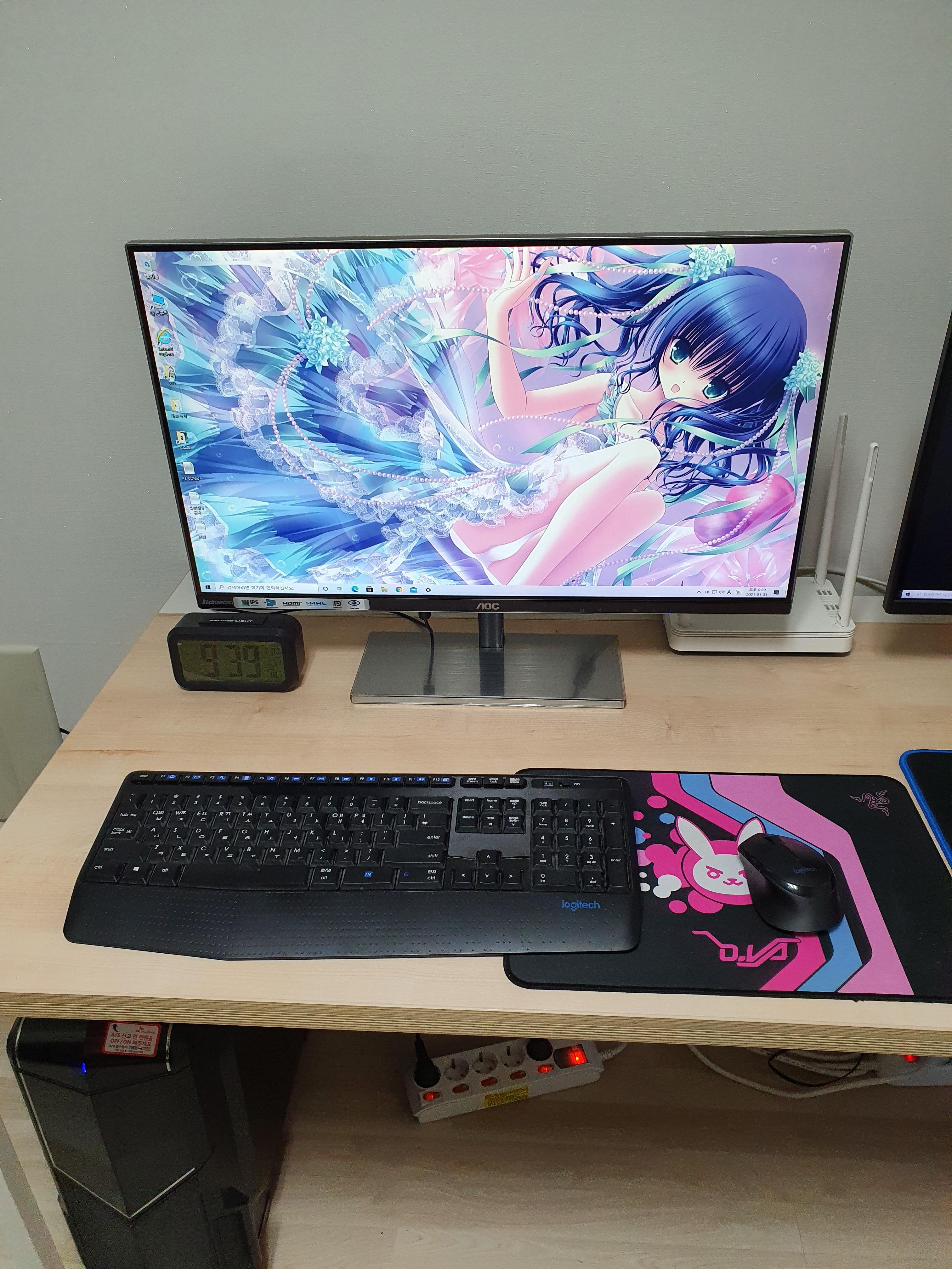 푸른 색상이 괜찮군요. 아래에 디바 마우스 패드가 인상적입니다 ㅋ 시계와 공유기도 보이네요.