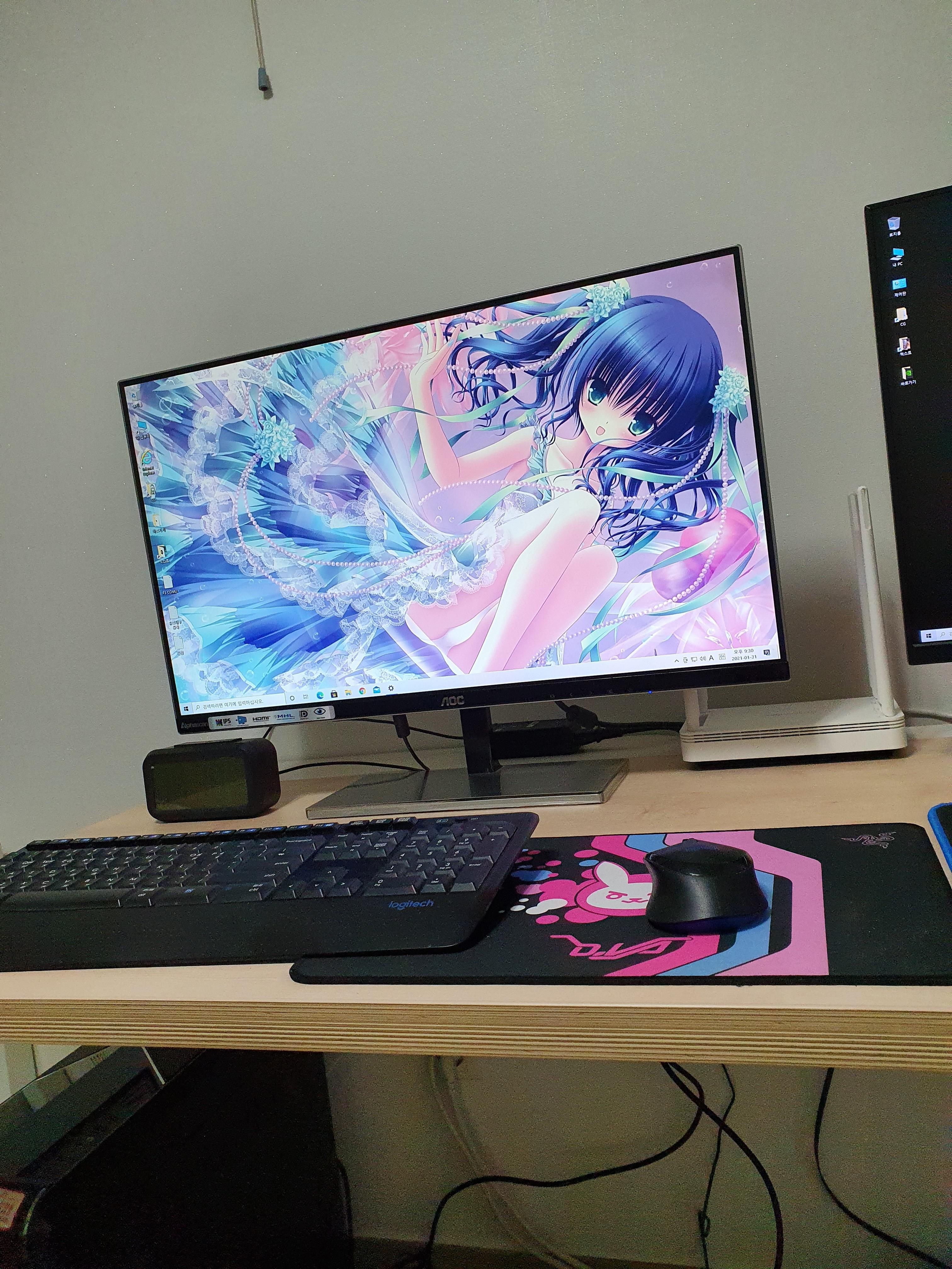 오른편 모니터는 한성 제품으로 VA 패널이라 그런지 색감이 물 빠진 느낌이었습니다. 색상이 약간 흐리거나 연하게 나오는 정도였지만 제 눈이 생각보다 예민하게 반응해서 (평소 일러스트를 자주 봐서 그런지) 쓰기에는 그냥 그랬습니다. 대신에 QHD 해상도에 주사율이 144Hz라 좋았습니다. 이때 고주사율 모니터를 처음 써 봤는데 마우스를 움직일 때 더 부드럽고 자연스럽게 모션이 보여서 감탄했다는.... 이후로 주사율 낮은 모니터는 못 쓰겠더군요. 게임할 때도 프레임이 좋아진 것이 티가 나고요. 그리고 영화 같은 것들을 볼 때는 분위기가 잘 어울려서 괜찮았습니다.