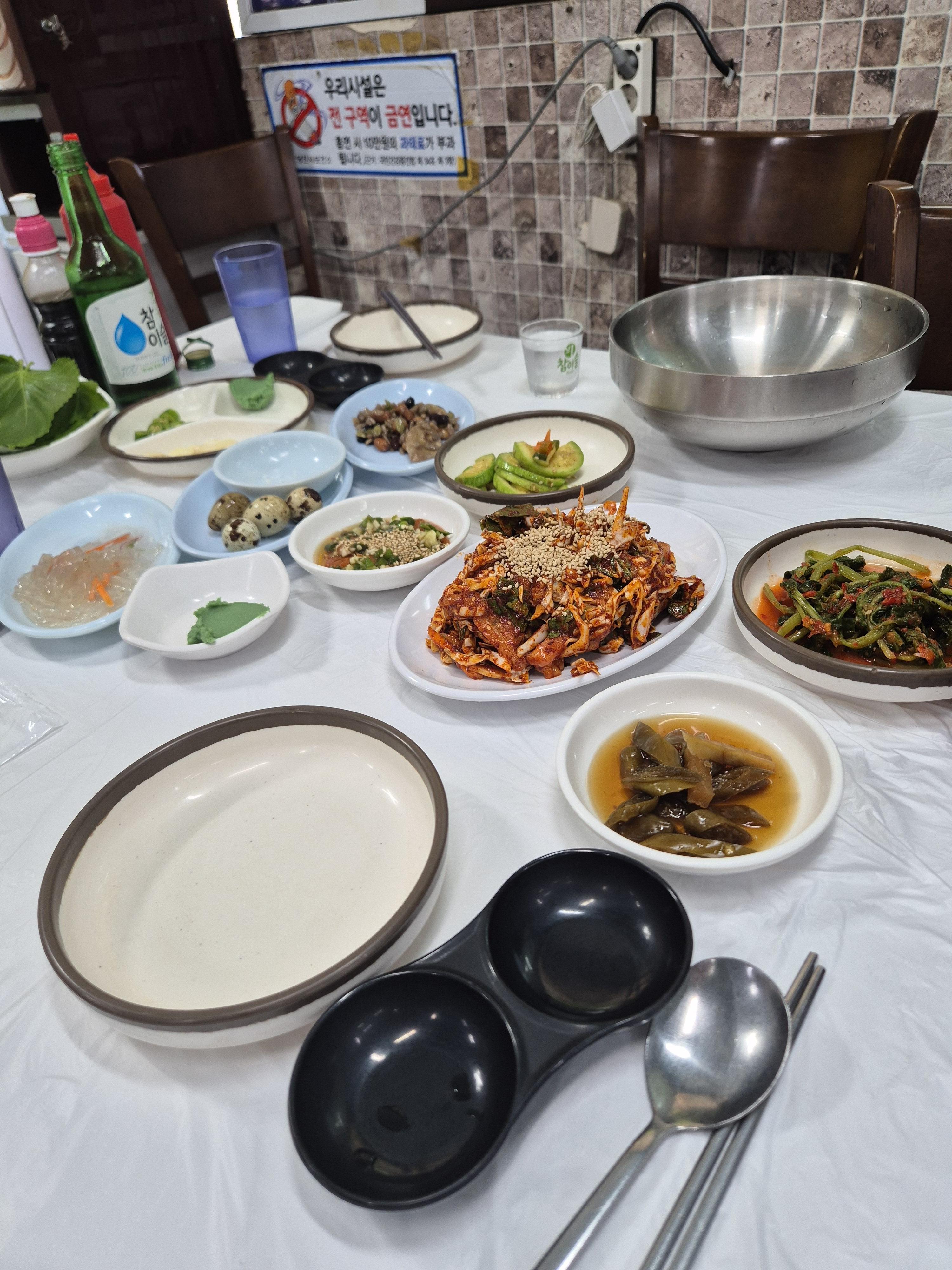 새우가 오기 전 상차림 모습입니다. 맛깔스러운 기본 반찬과 같이 나왔던 음식이 전어 무침인가 그랬을 겁니다. 오독거리는 식감이 괜찮았습니다. 먹을만하더군요.