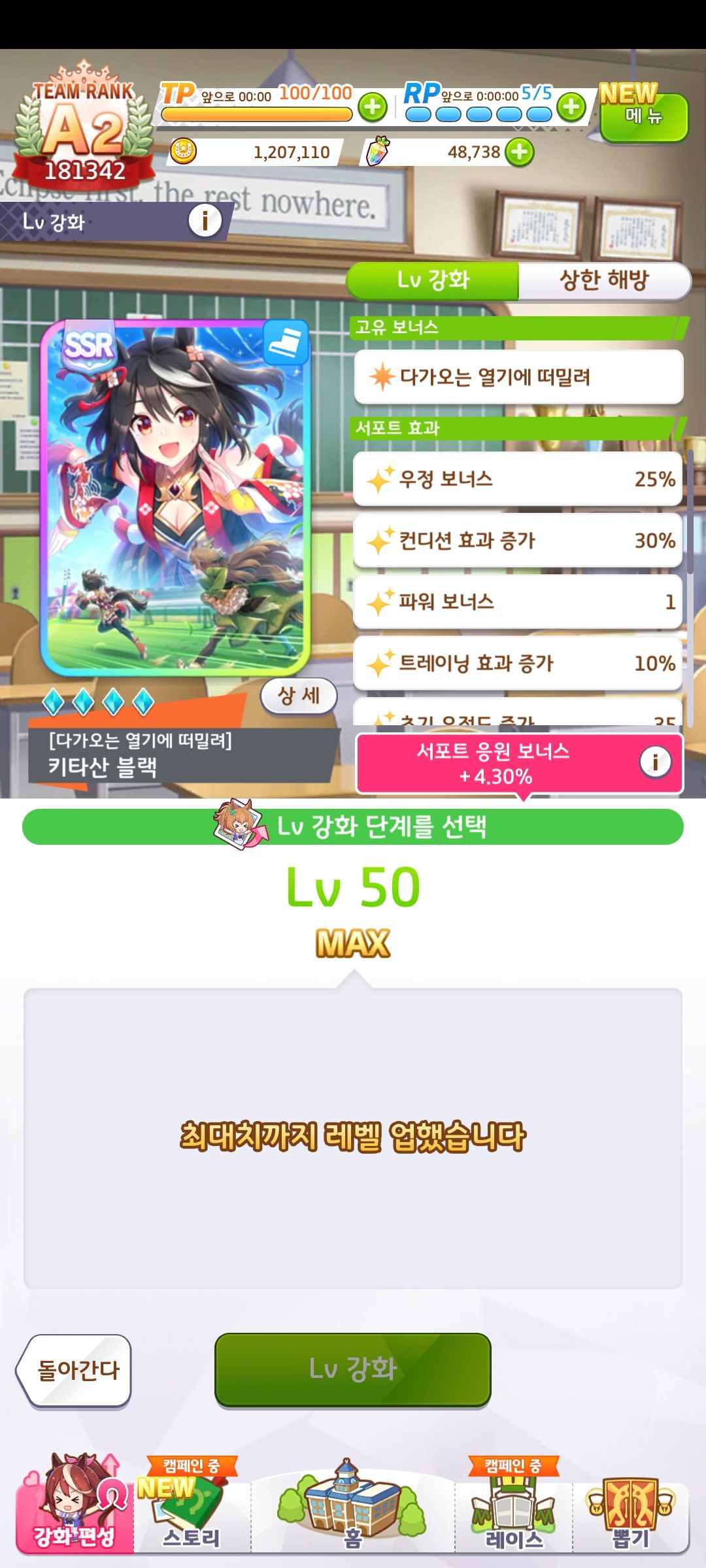 여기까지 참 좋았지만 다른 풀돌 SSR 서포트 카드가 없어서 그런지 육성이 수월해지긴 했어도 육성 랭크는 그렇게 많이 차이가 안 나네요. 잘해야 한, 두 단계 오르는 정도? 좋다고는 느꼈지만 큰 체감은 없었습니다. 하지만 없을 때보다는 한결 낫고 또 막상 안 쓰면 성능이 아쉬울 것 같습니다. 필수 카드 임에는 분명합니다. 보유 스킬인 호선의 프로페서도 괜찮고요. 포스팅을 하는 시점에서는 다른 쟁쟁한 SSR 카드들이 잔뜩 출시되긴 했습니다. 그래도 키타산 블랙 풀돌이 있으면 좋죠.